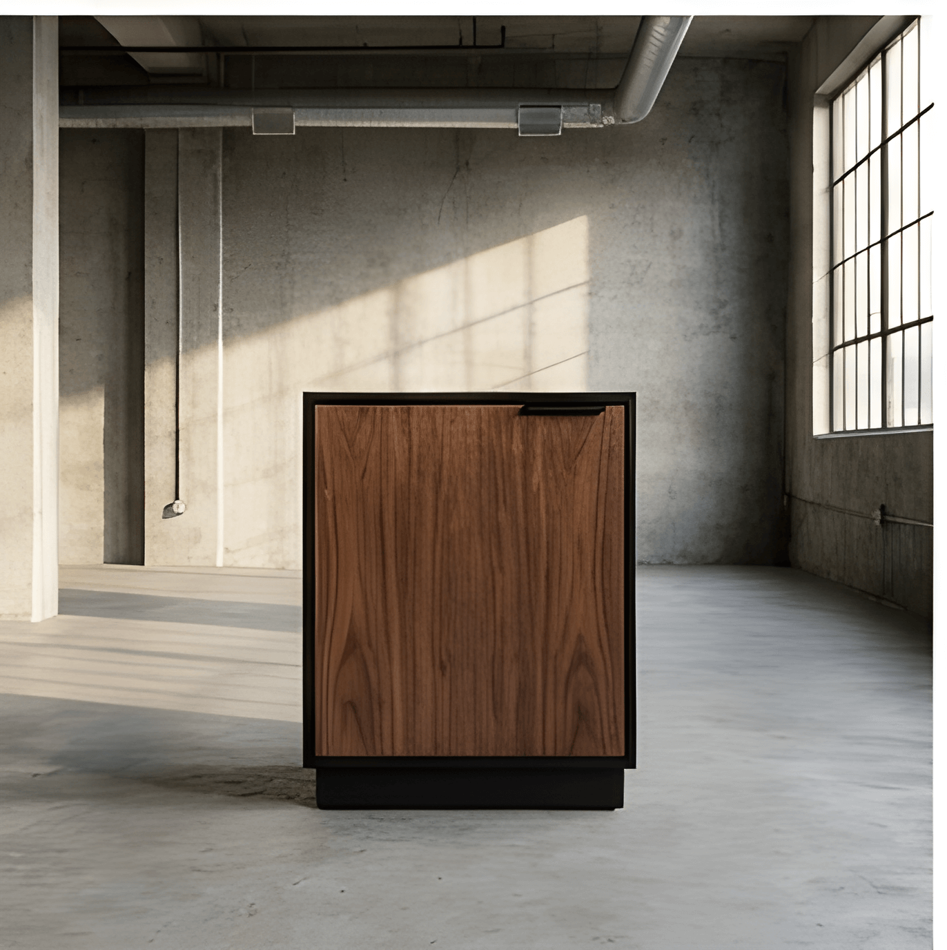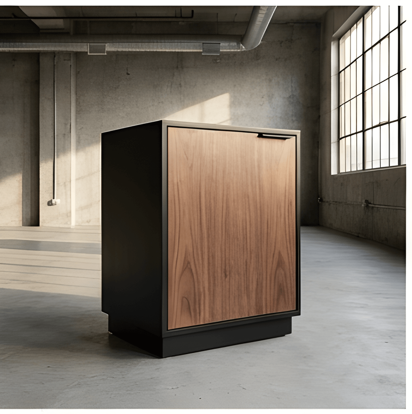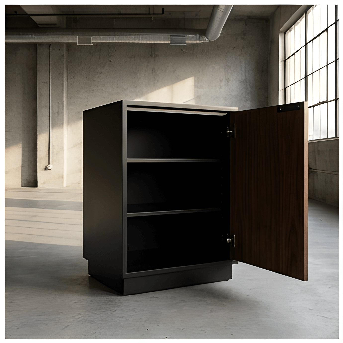 A solid hardwood door matched to your desk selection is paired with a matte black carcass for long-term durability and visual consistency.